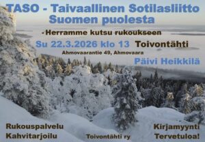 Tervetuloa kuulolle maanantaisin klo 12.00 (alkaen ma 2.2), Suomen Rukousrintaman fb-ryhmään (julkinen ryhmä) käymään kanssani läpi äskettäin ilmestynyttä kirjaani TASO -Taivaallinen Sotilasliitto ja Kansallinen Rukousarmeija! Pääset ryhmään tästä linkistä: