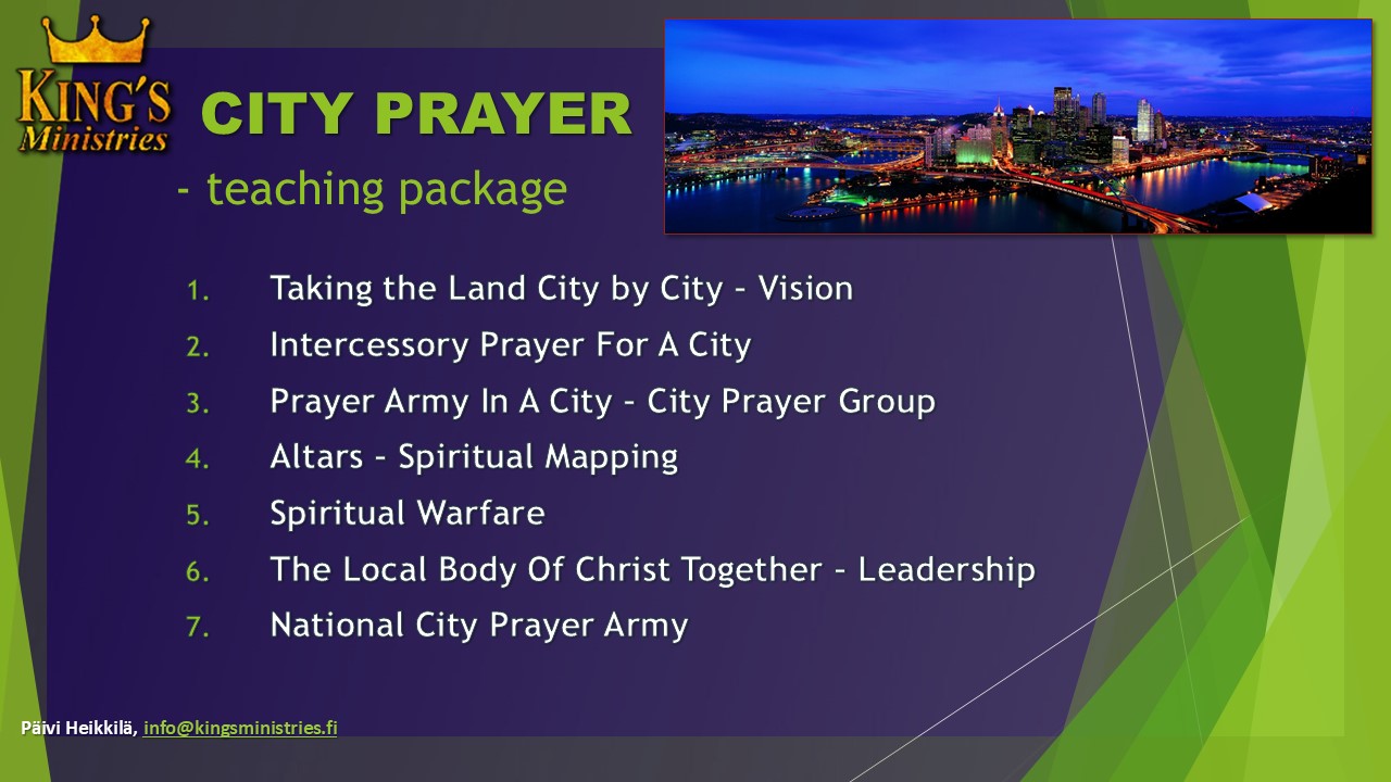 Päivi Heikkilä’s City Prayer Teaching Package of 12 pages power point presentation. Order from info@kingsministries.fi free to your e-mail -address. It contains the subjects 1) Taking the Land City by City – Vision, 2) Intercessory Prayer for a City, 3) Prayer Army in a City – City Prayer Group, 4) Altars – Spiritual Mapping, 5) Spiritual Warfare, 6) The Local Body of Christ Together – Leadership and 7) National City Prayer Army.