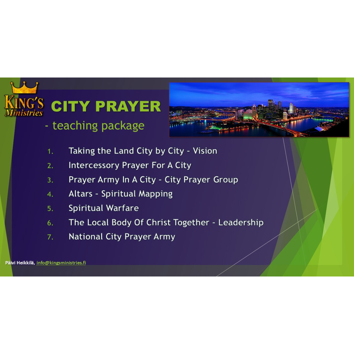 Päivi Heikkilä’s City Prayer Teaching Package PowerPoint picture presentation (which can be saved after purchasing in a PowerPoint slide show form for presentation). It contains the subjects 1) Taking the Land City by City – Vision, 2) Intercessory Prayer for a City, 3) Prayer Army in a City – City Prayer Group, 4) Altars – Spiritual Mapping, 5) Spiritual Warfare, 6) The Local Body of Christ Together – Leadership and 7) National (City) Prayer Army.