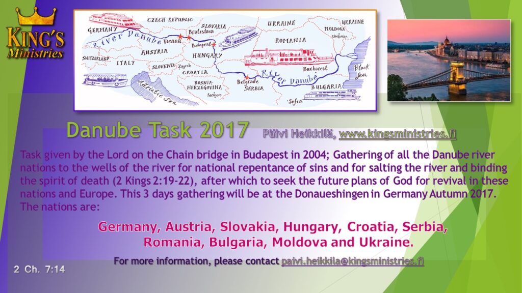 Vuonna 2014 asia alkoi tuntua ajankohtaiselta. Ja Jom Kibburin aikaan, 29.9.-1.10., vuonna 2017 kokoontuminen toteutettiin Saksassa, Donaueschingenissä. Kaikkien 10 maan edustajat olivat paikalla pyytämässä anteeksi kansallisia syntejään. Otimme ehtoollisen, suolasimme joen veden sen molemmilla alkulähteillä Brigahissa ja Pregissä, sidoimme joesta kuoleman hengen, ja julistimme Jeesuksen Kristuksen voittoa yli kaikkien pimeyden valtojen.